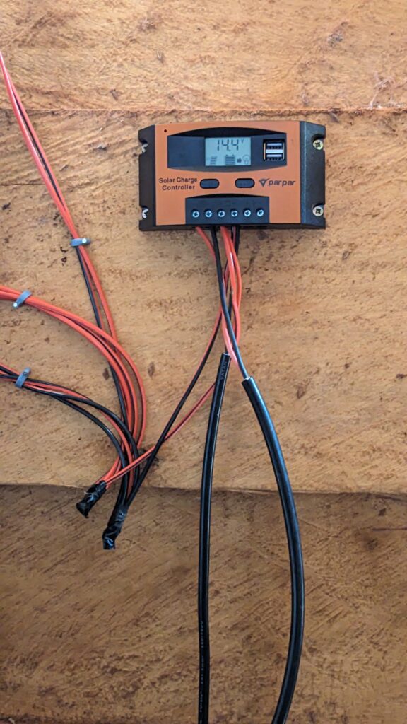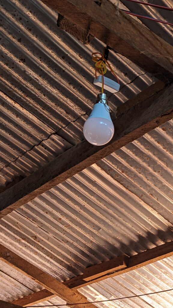 Un équipement comprend : un panneau solaire, un contrôleur de charge avec chargeur de téléphone portable, une batterie, 4 ampoules et un interrupteur pour chaque ampoule.